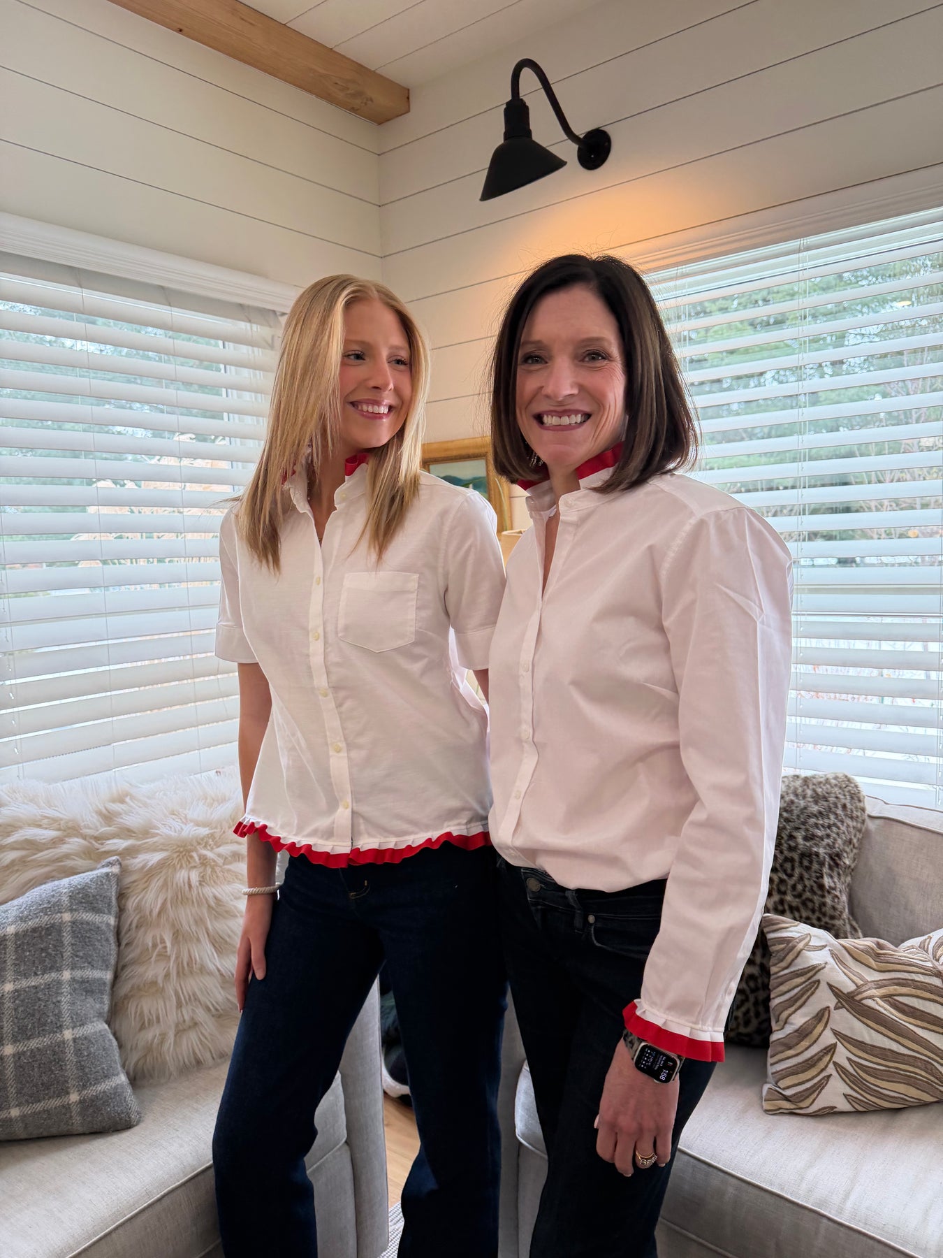 Every one wears our shirts differently; some open, some buttoned.  The oxford shirt has breast darts and is JUST a smidgen roomier at the bust line and tapered slightly in the body.