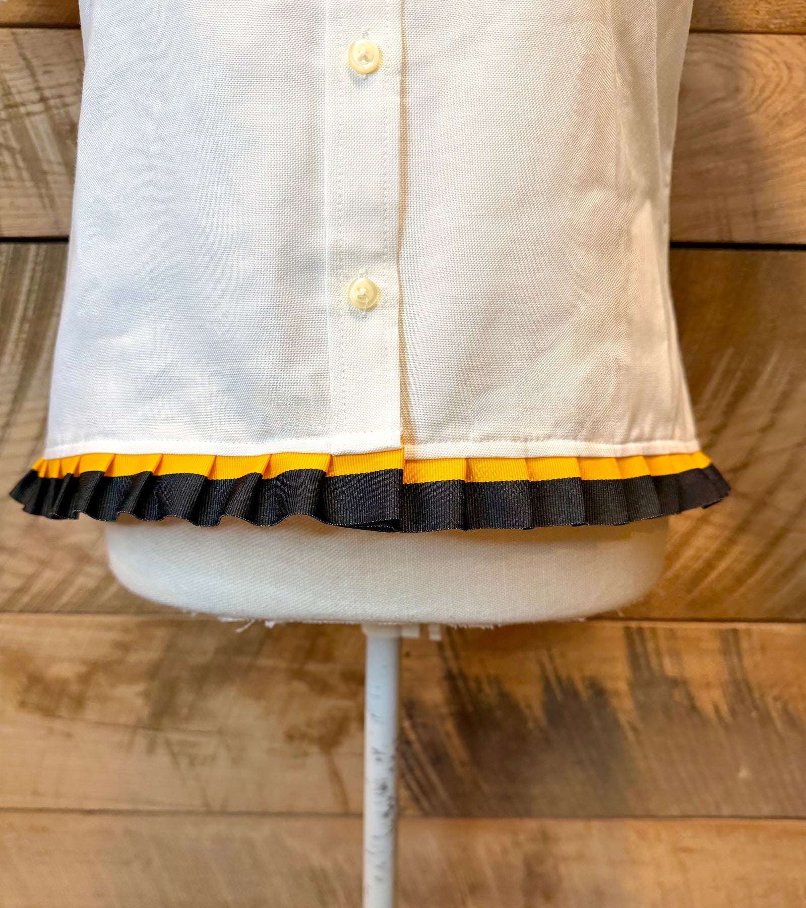 Ellie got an update with a shorter profile and a ruffled ribbon at the hem and collar. It's the perfect addition to your "sportswear" collection! So sweet with blue jeans, white jeans, shorts, peddle pushers - and everything in between - this one is perfect!