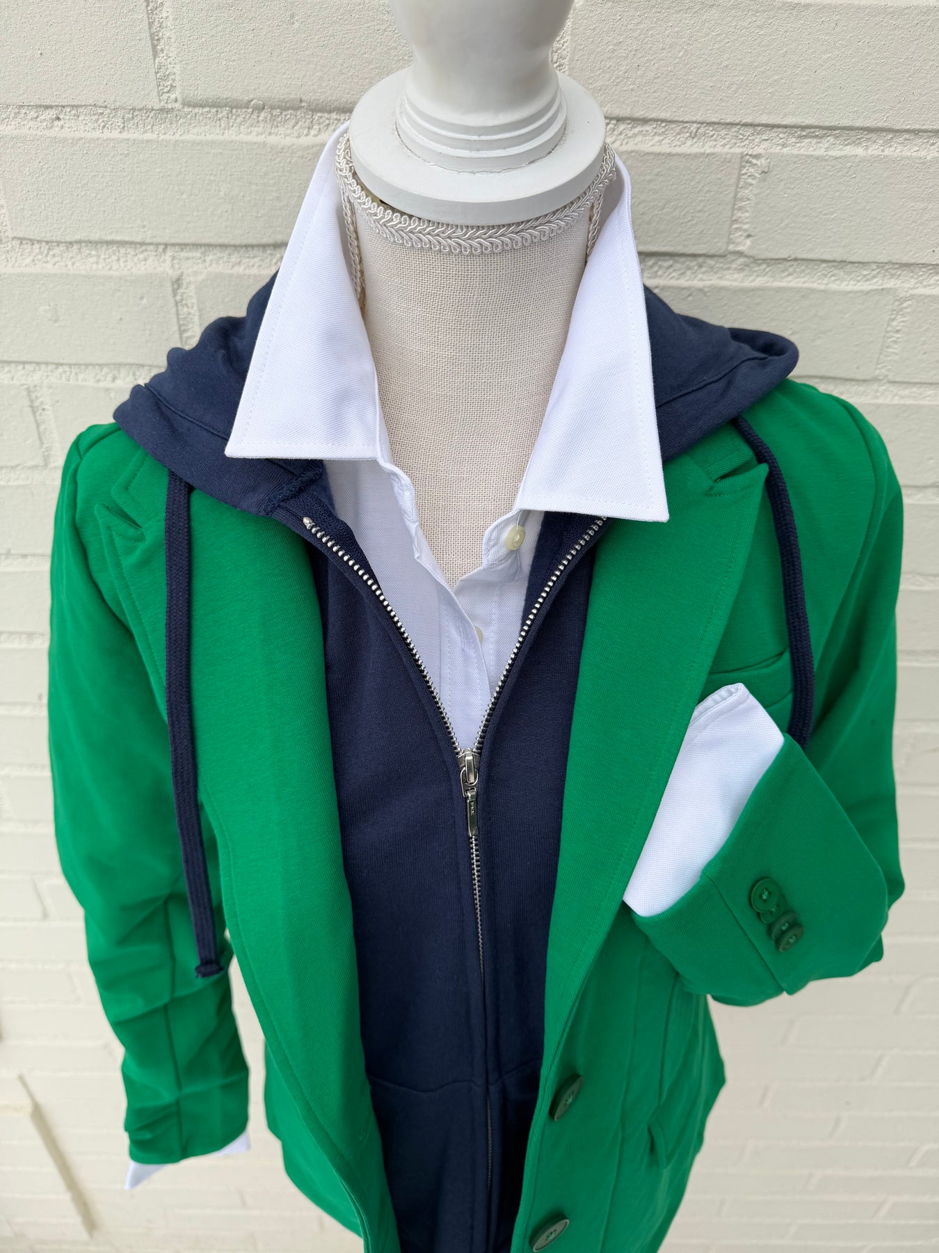 Tracey is the perfect travel companion for the office, plane, and your next vacation. The classic structured jacket is made of a cotton knit so it is machine washable and the hoodie adds a fun flair.