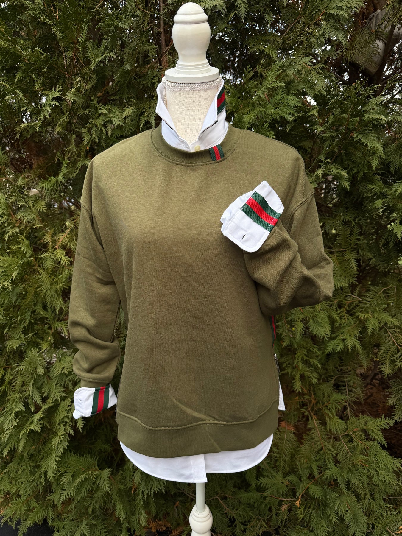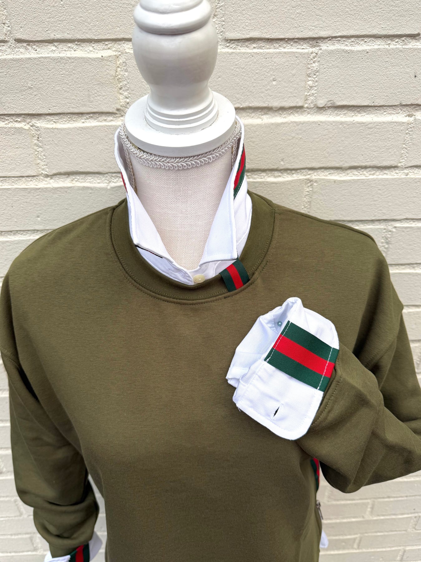 Danny Crew Neck Sweatshirt - Olive w Hunter & Red Stripe Ribbon (Danny15)
